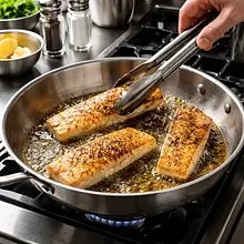 Smażenie ryby: rozgrzej dużą patelnię (24-28 cm) na średnio-wysokim ogniu. Wlej 30 g oleju rzepakowego i dodaj 15 g masła. Gdy masło przestanie mocno penić się i zacznie lekko się pienić, włóż filety skórą do dołu (jeśli mają skórę). Smaż pierwszą stronę 3-4 minuty bez przesuwania filetu, aż powstanie złota, chrupiąca skórka. Obróć delikatnie łopatką i smaż drugą stronę kolejne 3-4 minuty. Ryba jest gotowa, gdy mięso jest nieprzezroczyste, łatwo się rozdziela widelcem i osiąga temperaturę wewnętrzną około 63°C.