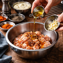 Przygotuj marynatę dla kurczaka: do średniej miski wlej 15 g oleju rzepakowego (1 łyżka), dodaj 3 ząbki drobno posiekanego czosnku (15 g), 3 g soli (połowa dostępnej ilości), 1 g pieprzu (szczypta), 3 g kminu (ok. połowa porcji) i 3 g papryki słodkiej. Wyciśnij sok z połowy cytryny (ok. 30 g) i dodaj do mieszanki. Wymieszaj widelcem do jednolitej emulsji.
