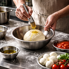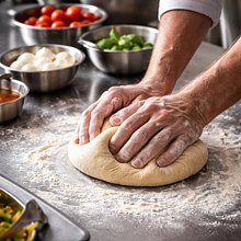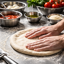 Weź jedną kulę ciasta, lekko spłaszcz palcami, a następnie rozciągnij ją od środka na zewnątrz, używając kciuków, pozostawiając grubszy brzeg (ok. 1–1,5 cm). Unikaj wałkowania jeśli chcesz zachować pęcherzykowate brzegi — rozciągaj ręcznie. Uzyskaj krążek o średnicy ok. 26–28 cm.