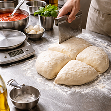 Gdy ciasto wyrośnie, przełóż je na stolnicę i podziel na 4 równe części (użyj wagi, każda porcja około 200-210 g). Uformuj z każdej części kulę: przytrzymaj ciasto dłonią i zawijaj brzegi pod spód, rotując kulę po powierzchni, aż wierzch będzie gładki.