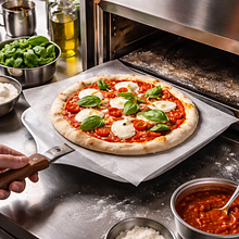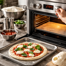 Przenieś pizzę na gorący kamień lub blachę (użyj łopaty do pizzy lub pergaminu). Piecz w temperaturze 250–280°C przez 6–9 minut (jeśli masz kamień i wysoka temperatura) lub 10–14 minut w zwykłym piekarniku, aż brzegi będą złociste z pęcherzykami, a ser się rozpuści i lekko zrumieni.