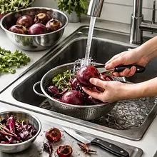 Użyj naczynia żaroodpornego lub brytfanny. Czas pieczenia zależy od wielkości buraków; mały burak będzie gotowy po 40–45 minutach, duży może potrzebować do 60 minut. Po upieczeniu ostudź do temperatury umożliwiającej obróbkę (ok. 15–20 minut).