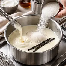 Użyj rondelka o grubym dnie, aby uniknąć przypalenia śmietanki. Mieszaj drewnianą łyżką lub silikonową łopatką. Jeśli używasz ekstraktu waniliowego zamiast laski, dodaj go pod koniec podgrzewania (1–2 łyżeczki).