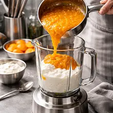 Do kielicha blendera włóż ostudzone puree kaki-mandarynki (ok. 400 g puree), dodaj gęsty jogurt grecki (200 g), mleko (150 ml) oraz kostki lodu (200 g). Blenduj na wysokich obrotach przez 40-60 sekund, aż masa będzie gładka, kremowa i lekko spieniona. Sprawdź konsystencję: powinna być gładka, nie za wodnista; jeśli jest zbyt gęsta dodaj 20-30 ml mleka, jeśli zbyt rzadka — kilka dodatkowych kostek lodu i krótki puls.