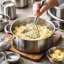 Przygotuj ziemniaki: obierz je ze skórki i pokrój na równe kawałki (ok. 3-4 cm), żeby gotowały się równomiernie. Umieść w garnku o pojemności min. 4 l, zalej zimną wodą tak, by przykryć ziemniaki na ok. 2 cm. Dodaj 1/3 ilości soli (ok. 3 g). Doprowadź do wrzenia na dużym ogniu, potem zmniejsz ogień, przykryj pokrywką i gotuj 18–25 minut — aż widelec łatwo wchodzi w ziemniak (mają być bardzo miękkie, niemal rozpadające się).