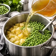 Do garnka dodaj pokrojone ziemniaki i mrożony groszek. Wlej bulion warzywny tak, aby składniki były przykryte (używamy 1000 ml). Zamieszaj i zwiększ ogień do dużego, aż płyn zacznie się gotować. Gdy zacznie wrzeć, zmniejsz ogień do średnio-niskiego i gotuj pod częściowym przykryciem przez 10–12 minut, aż ziemniaki będą miękkie — sprawdzisz to widelcem: widelec powinien wchodzić w ziemniak bez oporu i kawałek powinien się lekko rozpadać.