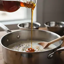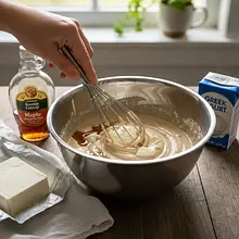 W osobnej, mniejszej misce umieść serek śmietankowy, jogurt grecki, mleko, syrop klonowy (2 łyżki), ekstrakt waniliowy oraz świeżo startą skórkę z cytryny. Za pomocą trzepaczki rózgowej lub miksera ręcznego na niskich obrotach, wymieszaj wszystko na idealnie gładką, kremową masę. Upewnij się, że nie ma żadnych grudek serka.