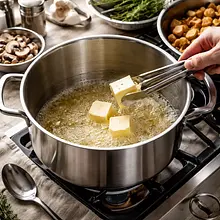 W dużym garnku o grubym dnie (ok. 4-5 litrów) rozpuść masło na średniej mocy palnika. Gdy masło zacznie się pienić, wrzuć posiekaną cebulę. Smaż przez około 5-7 minut, często mieszając drewnianą łyżką, aż cebula stanie się miękka, szklista i półprzezroczysta. Uważaj, aby jej nie przypalić, bo nada zupie gorzkiego smaku. Pod koniec smażenia dodaj posiekany czosnek i smaż jeszcze przez minutę, aż uwolni aromat.