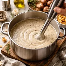 Za pomocą blendera ręcznego (żyrafy) zmiksuj zupę bezpośrednio w garnku na idealnie gładki, aksamitny krem. Wykonuj ruchy w górę i w dół, aby wciągnąć wszystkie składniki pod ostrza. Blenduj przez około 2-3 minuty, aż nie będzie żadnych grudek. Jeśli nie masz blendera ręcznego, przelewaj zupę partiami do blendera kielichowego i miksuj.