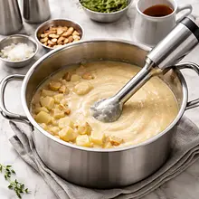 Gdy warzywa w zupie są już miękkie, zdejmij garnek z ognia. Użyj blendera ręcznego (żyrafy) i zmiksuj zupę bezpośrednio w garnku na idealnie gładki, aksamitny krem. Wykonuj ruchy w górę i w dół, aby wciągnąć wszystkie składniki pod ostrza. Miksuj przez około 2-3 minuty, aż nie będzie żadnych grudek.