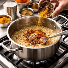 Zmniejsz moc palnika do minimum. Do garnka dodaj wszystkie sypkie przyprawy: garam masala, kurkumę, kmin rzymski, mieloną kolendrę i ostrą paprykę. Dodaj również koncentrat pomidorowy. Smaż wszystko razem, ciągle mieszając, przez około 30-60 sekund. To kluczowy moment, w którym uwalniają się olejki eteryczne z przypraw, co pogłębia smak całego dania.