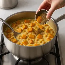 Gdy curry zacznie delikatnie bulgotać, zmniejsz ogień do minimum. Przykryj garnek i gotuj przez 10 minut, aby smaki się połączyły. Po tym czasie dodaj opłukaną ciecierzycę oraz mieszankę garam masala. Delikatnie wymieszaj i gotuj bez przykrycia przez kolejne 5 minut.