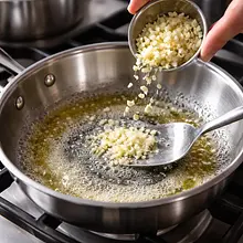 Dodaj posiekany czosnek (15 g) na rozgrzane masło i smaż bardzo krótko: 30–45 sekund, mieszając, aż czosnek zacznie wydzielać aromat i stanie się lekko złocisty. Nie dopuść do zbrązowienia — spalone kawałki będą gorzkie. Jeżeli używasz chili flakes (opcjonalnie), dodaj je teraz (2 g) i wymieszaj przez 5 sekund.