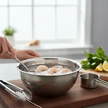 Zacznij od przygotowania krewetek. Jeśli używasz mrożonych, przełóż je do miski z zimną wodą na około 15-20 minut, aż całkowicie się rozmrożą, a następnie dokładnie osusz je ręcznikiem papierowym. Jeśli krewetki mają pancerze, zdejmij je, pozostawiając ogonki dla ozdoby i wygody jedzenia. Następnie, przy pomocy małego, ostrego nożyka (np. do warzyw), natnij grzbiet każdej krewetki na głębokość około 2-3 mm. Zobaczysz ciemną 'żyłkę' - to przewód pokarmowy. Delikatnie podważ go czubkiem noża lub wykałaczką i wyciągnij w całości. To kluczowy krok, który zapewni czysty smak dania. Opłucz krewetki pod zimną wodą i ponownie bardzo dokładnie osusz.