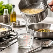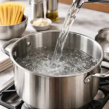 Na około 1 minutę przed końcem gotowania przygotuj szklankę (ok. 200-250 ml). Odlej z garnka 120 ml gorącej wody z gotowania makaronu do szklanki; ta skrobiowa woda pomoże połączyć oliwę z makaronem w kremowy sos. Następnie odcedź makaron używając durszlaka, ale nie spłukuj go wodą — chcemy zachować mączystą skrobię.