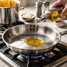 Postaw patelnię na średnio-niskim ogniu. Wlej oliwę z oliwek (60 g) i ogrzewaj powoli 30-45 sekund — oliwa powinna być ciepła, nie gorąca. Dodaj cienkie plasterki czosnku rozłożone równomiernie na powierzchni patelni. Smaż na bardzo łagodnym ogniu 1,5-2 minuty, mieszając co kilkanaście sekund, aż plasterki staną się jasnozłote i puszczą aromat. Jeśli używasz płatków chili, dodaj je równocześnie z czosnkiem lub po 30 sekundach w zależności od preferowanej ostrości.