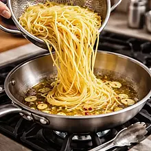 Wrzuć odcedzony makaron bezpośrednio na patelnię z oliwą i czosnkiem. Zwiększ ogień do średniego i energicznie mieszaj (użyj szczypiec lub dwóch widelców) przez 1-2 minuty, aby makaron wchłonął oliwę i aromat czosnku. Jeśli sos wydaje się zbyt suchy, dodaj jeszcze 1-2 łyżki (15-30 ml) rezerwowanej wody i mieszaj do uzyskania jedwabistej konsystencji. Na koniec dodaj drobno posiekaną natkę pietruszki i dwie szczypty świeżo zmielonego pieprzu.