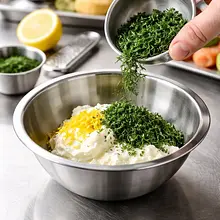 Przygotuj stanowisko pracy: deska, ostry, ząbkowany nóż do chleba, mała miska, tarka do cytryny, łyżka do mieszania i blacha wyłożona papierem do pieczenia. Umyj koperek i rukolę pod bieżącą, chłodną wodą, osusz delikatnie ręcznikiem papierowym.