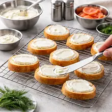 Po przygotowaniu odłóż resztki łososia i serka do szczelnych pojemników i wstaw do lodówki. Umyj narzędzia i deskę. Jeżeli przygotujesz kanapki wcześniej, nie montuj ich całkowicie — przechowuj składniki osobno i zmontuj na 15-20 minut przed podaniem.