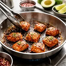 Smażenie/grillowanie łososia: rozgrzej patelnię żeliwną lub nieprzywierającą na średnio-wysokim ogniu i dodaj 1 łyżkę oleju rzepakowego (ok. 15 g). Gdy olej zacznie lekko dymić (ok. 2–3 minuty), kładź kawałki łososia skórą do dołu (jeśli mają skórę) lub płaską stroną. Smaż 2–3 minuty bez ruszania, aż dolna strona będzie intensywnie zrumieniona. Obróć ostrożnie łososia i smaż kolejne 1–2 minuty, ścierając pozostałą glazurę na powierzchnię łososia. Jeśli wolisz użyć piekarnika, ułóż łososia na blasze i piecz w temperaturze 200°C przez 8–10 minut, a pod koniec posmaruj resztą glazury i włącz opcję grill/grzanie górne na 1–2 minuty do skarmelizowania glazury.