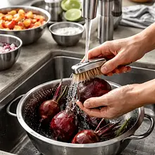 Rozgrzej piekarnik do 200°C (góra-dół). Umyj dokładnie buraki szczotką pod bieżącą wodą, odetnij liście i korzonki. Osusz papierowym ręcznikiem. Każdy burak owiń pojedynczo w folię aluminiową tak, aby nie dochodziło powietrze do wnętrza. Ułóż owinięte buraki na blasze wyłożonej papierem do pieczenia i piecz przez 50-60 minut, aż będą miękkie przy nakłuciu wykałaczką (powinna wchodzić łatwo).