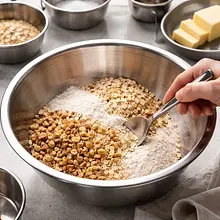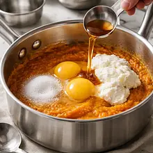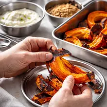 Nagrzej piekarnik do 200°C (góra-dół). Jeśli używasz całej dyni Hokkaido: przekrój ją na pół, usuń nasiona i błony łyżką, a następnie pokrój miąższ na równe kawałki (ok. 3-4 cm). Jeśli masz gotowy miąższ, po prostu pokrój na kawałki. Umieść kawałki dyni na blasze wyłożonej papierem do pieczenia skórą do dołu (jeśli skórka jest), skrop równomiernie olejem rzepakowym i posyp połową cukru trzcinowego (40 g). Piecz 30-35 minut, aż miąższ będzie miękki i zacznie się lekko rumienić — sprawdzisz to wbiciem małego noża: nóż powinien wchodzić gładko i bez oporu.