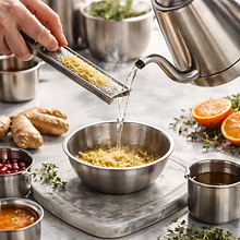 Zetrzyj świeży imbir (20 g) na drobnej tarce do małej miseczki. Zalej starty imbir 40 ml gorącej (nie wrzącej) wody o temperaturze około 70-80°C i odstaw na 3 minuty, aby uwolnił aromaty. Po 3 minutach przecedź przez drobne sitko, mocno dociskając pulpy, by wydobyć jak najwięcej płynu - otrzymasz intensywny koncentrat imbirowy. Odstaw do lekkiego przestudzenia (około 1-2 minuty).