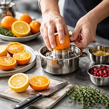 Przekrój klementyny (320 g w sumie, ok. 4 szt.) i cytrynę (60 g) na pół i wyciśnij sok ręcznym wyciskaczem bezpośrednio do dzbanka lub miski. Po wyciśnięciu przetrzyj sok przez drobne sitko, aby pozbyć się ziarenek i większego miąższu — użyj łyżki, by delikatnie przepchnąć sok przez sitko. Sok powinien być jednolity, intensywnie pomarańczowy i pachnący. Sprawdź smak: jeśli sok jest bardzo kwaśny, możesz dodać łyżeczkę syropu imbirowo-miodowego.