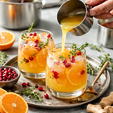 Szybki, sezonowy napój musujący łączący soczyste klementyny z ostrym świeżym imbirem i czerwonym akcentem pestek granatu. Lekko pikantny, orzeźwiający i bardzo efektowny - warstwa soku o intensywnym pomarańczowym kolorze przechodzi w delikatną pęcherzykową czapę wody gazowanej z unoszącymi się nasionami granatu i gałązką tymianku. Idealny jako alternatywa dla cięższych, zimowych drinków: świetny podczas spotkań, jako napój powitalny lub na świąteczny stół. Aromat imbiru podbija słodycz klementyn, a opcjonalny miodowy syrop wygładza pikantność i dodaje błyszczącej, lepko-czerwonej warstwy na dnie szklanki, co sprawia że koktajl jest atrakcyjny wizualnie i zbalansowany smakowo.