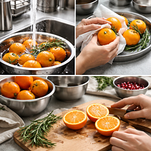 Umyj klementynki i rozmaryn pod bieżącą wodą. Osusz delikatnie ręcznikiem papierowym. Przekrój dwie klementynki na pół i wyciśnij z nich sok do miarki; powinnaś otrzymać około 240 ml soku (z 3 średnich klementynek). Jeśli sok jest zbyt gęsty lub zawiera pestki, przetrzyj go przez drobne sitko do czystego dzbanka.