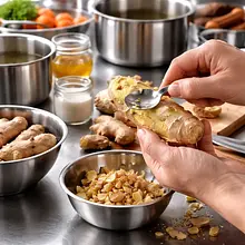 Przygotuj syrop imbirowy: obierz korzeń imbiru (użyj łyżeczki do zeskrobania skóry lub cienkiego noża), pokrój na cienkie plasterki (ok. 3-4 mm). W małym rondelku połącz 150 g cukru i 150 ml wody, dodaj plasterki imbiru. Postaw na średnim ogniu i doprowadź do delikatnego wrzenia, mieszając, aż cukier się rozpuści. Zmniejsz ogień i gotuj przez 8-10 minut — syrop powinien lekko zgęstnieć i nabrać złocistego koloru. Zdejmij z ognia, odstaw na 10 minut do naciągnięcia, przelej przez drobne sitko do słoika i dodaj 30 ml świeżego soku z cytryny, wymieszaj. Po ostudzeniu przechowuj w lodówce.