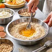 W środku suchych składników zrób wgłębienie, wbij jajko (60 g) i szybko wymieszaj widelcem tylko środkową część, łącząc stopniowo suche składniki z jajkiem. Jeśli ciasto jest zbyt suche, dodaj bardzo zimną łyżkę wody (maksymalnie 10-15 g), po czym zagnieć krótko rękoma lub mikserem z hakiem do ciasta, aż składniki się zwiążą w zwartą kulę.