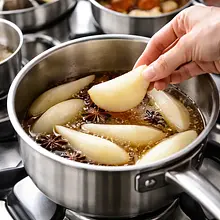 Do gorącego syropu delikatnie włóż przygotowane kawałki gruszek, zmniejsz ogień do niskiego i gotuj 8–12 minut w zależności od wielkości kawałków. Gruszki są gotowe, gdy są miękkie przy nakłuciu widelcem, ale wciąż trzymają formę — sprawdź jedną sztukę.