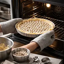 Wstaw formę z obciążeniem do piekarnika i piecz blind-bake przez 15 minut, następnie usuń obciążenie i papier i piecz jeszcze 8–10 minut, aż spód będzie złocisty. Wyjmij i całkowicie ostudź na kratce.