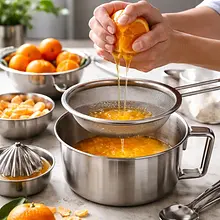 Z mandarynek (300 g) wyciśnij sok — powinno wyjść ok. 180–200 g soku. Przecedź sok przez drobne sitko do garnuszka. Dodaj 20 g cukru (dobrze sprawdza się drobny cukier) i zagotuj na średnim ogniu. Wsyp agar-agar (2 g) i dokładnie wymieszaj; gotuj 1–2 minuty, aż agar się rozpuści. Zdejmij z ognia i odstaw na 2–3 minuty, aby lekko przestygł.