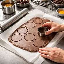 Rozwałkuj ciasto między arkuszami papieru do pieczenia do grubości około 5 mm. Wykrój krążki o średnicy około 7–8 cm (dopasowane do formy lub szablonu), ułóż na blasze w odstępach 2–3 cm. Piecz w nagrzanym piekarniku 12–15 minut, aż krawędzie będą lekko złociste. Po upieczeniu odstaw do całkowitego ostygnięcia na kratce — ciasteczka stwardnieją i będą chrupiące.