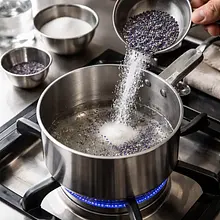 W małym rondelku umieść cukier (80 g), wodę (80 ml) i suszoną lawendę (5 g). Podgrzewaj na średnim ogniu do całkowitego rozpuszczenia cukru, tyle że nie dopuszczaj do intensywnego wrzenia — pozwól, by syrop delikatnie bulgotał przez 2–3 minuty. Zdejmij z ognia i pozostaw do naciągnięcia 15–20 minut, aby lawenda oddała aromat. Przecedź syrop przez drobne sito, aby usunąć kwiaty.