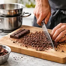 Posiekaj czekoladę gorzką 70% (150 g) na drobne kawałki. Przygotuj miskę nad kąpielą wodną: do garnka z niewielką ilością wrzącej wody połóż miskę (nie dotykając wody). Umieść 2/3 czekolady w misce i podgrzewaj, mieszając szpatułką, aż rozpuści się do temperatury około 45–48°C. Zdejmij miskę i dodaj resztę pokrojonej czekolady (1/3) i mieszaj, aż temperatura spadnie do około 30–31°C — to metoda temperowania przez dodanie tableru.