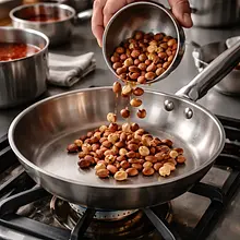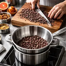Przygotuj pralinę: rozgrzej suchą patelnię na średnim ogniu. Wsyp migdały (100 g) i orzechy laskowe (100 g) i praż przez 6-8 minut, mieszając co 1-2 minuty drewnianą łyżką, aż zaczną złocić się i pachnieć orzechowo. Przełóż do miski, ostudź do temperatury pokojowej. W międzyczasie na małym rondelku rozpuść 80 g cukru na średnim ogniu, nie mieszając łyżką — możesz delikatnie potrząsać rondelkiem, aż cukier zacznie się topić i stanie się bursztynowy (ok. 6-8 minut). Gdy cukier osiągnie złoto-bursztynowy kolor, zdejmij rondel z ognia i szybko wlej karmel na blachę wyłożoną papierem do pieczenia, rozprowadź cienką warstwą. Rozsyp prażone orzechy na gorący karmel i poczekaj, aż stwardnieje (5-10 minut). Złamaną na kawałki pralinę zmiksuj pulsonowo w malakserze na gruboziarnistą kruszonkę — uważaj, aby nie miksować na pastę. Na końcu, gdy masa jest jeszcze lekko ciepła, dodaj masło (30 g) i krótko zmiksuj, żeby powstały mniejsze bryłki i lekko błyszcząca pralinowa kruszonka.
