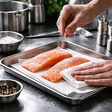 Użyj patelni o średnicy min. 28 cm. Jeśli skóra przywiera, odczekaj 20-30 sekund – po tym czasie naturalnie puści. Sprawdź stopień wysmażenia naciskając mięso: powinno być sprężyste i lekko soczyste w środku.