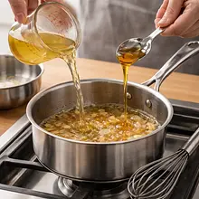 Dodaj do rondla ciepły bulion drobiowy (250 ml) i miód (30 g). Zmniejsz ogień i gotuj 8–10 minut aż sos nieco zgęstnieje. Spróbuj i w razie potrzeby dopraw solą i pieprzem. Na koniec zmiksuj sos blenderem ręcznym przez kilka sekund dla jednorodnej tekstury i dodaj 10 g masła, mieszając aż się rozpuści dla połysku.
