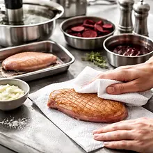 Wyjmij piersi z kaczki z lodówki na 30 minut przed gotowaniem, aby osiągnęły temperaturę pokojową — to zapewni równomierne gotowanie. Oczyść kawałki z ewentualnych resztek piór i osusz papierowym ręcznikiem. Ostrym nożem wykonaj delikatne nacięcia skóry w kratkę (nie przecinaj mięsa) pod kątem 45°, co ułatwi wytapianie tłuszczu i uzyskanie chrupiącej skórki.