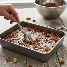 Przełóż całą masę do przygotowanej formy. Teraz kluczowy etap: ugniatanie. Użyj grzbietu łyżki, dna szklanki lub zwilżonych dłoni, aby bardzo mocno i równomiernie docisnąć masę do dna formy. Musisz ją sprasować tak mocno, jak to tylko możliwe. Im lepiej ją ubijesz, tym bardziej zwarte i nierozpadające się będą batony. Powierzchnia powinna być gładka i równa.