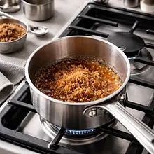 W małym rondlu o grubym dnie umieść 100 g cukru trzcinowego. Podgrzewaj na średnim ogniu bez mieszania, gdy cukier zacznie się topić na brzegach, użyj silikonowej szpatułki, aby delikatnie zsunąć rozpuszczony cukier w kierunku środka. Gdy cały cukier stanie się bursztynowy (ok. 6-8 minut), zdejmij rondel z ognia. Dodaj od razu 25 g masła i mieszaj energicznie — karmel zacznie bulgotać (uważaj na parę). Po ostrożnym wymieszaniu dodaj 20 g białego miso rozpuszczonego wcześniej w 1 łyżce (15 g) gorącej wody, energicznie wymieszaj na gładką glazurę. Dodaj szczypnięcie soli (1 g).