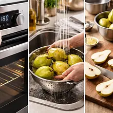Nagrzej piekarnik do 180°C (grzanie góra‑dół). Umyj gruszki, przetnij każdą na pół wzdłuż i delikatnie usuń gniazda nasienne łyżeczką, tworząc niewielkie wgłębienie u środka (nie wydrążaj zbyt głęboko, by nie przeciąć spodu). Skórę możesz zostawić — nada koloru podczas pieczenia. Ułóż połówki w naczyniu żaroodpornym skórą do dołu.