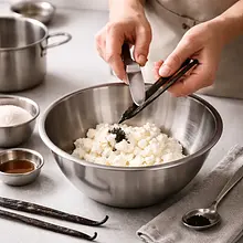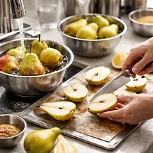 Przygotuj sos: w średnim rondlu umieść maliny mrożone (200 g) i żurawinę świeżą (100 g). Dodaj miód (30 g) i sok z cytryny (30 ml). Podgrzewaj na średnim ogniu, mieszając drewnianą łyżką, aż owoce się rozmrożą i zacznie tworzyć się sok (ok. 4-6 minut). Zmniejsz ogień i gotuj na małym ogniu przez 8-10 minut, aż owoce rozpadną się i sos lekko zgęstnieje. Jeśli chcesz gładki sos, przecedź przez sitko o drobnych oczkach i wciśnij łyżką, pozostawiając wazę gładkiego puree; jeśli wolisz bardziej rustykalny sos, zostaw z kawałkami owoców.