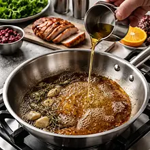 Użyj szerokiej, płaskiej patelni lub rondelka. Jeśli glazura zbyt szybko się karmelizuje, zmniejsz ogień. Glazura powinna być błyszcząca i lekko lepka — nie spalona.