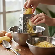 Ziemniaki oraz cebulę (tę w całości) obierz i zetrzyj na tarce o drobnych oczkach. Możesz użyć tarki ręcznej lub malaksera z odpowiednią końcówką. Powstałą masę przełóż na gęste sito lub do czystej ściereczki kuchennej i bardzo dokładnie odciśnij nadmiar wody. To najważniejszy krok dla uzyskania chrupkości! Im suchsza masa, tym lepszy placek.