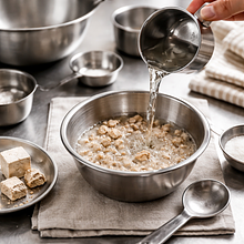 Aktywuj drożdże: w małej miseczce rozkrusz drożdże świeże, dodaj 30 ml letniej wody (z ogólnej ilości) oraz 10 g cukru. Delikatnie wymieszaj widelcem, aż drożdże się rozpuszczą. Odstaw na 8–10 minut w ciepłe miejsce. Powierzchnia powinna stać się pienista — to oznaka, że drożdże są aktywne.