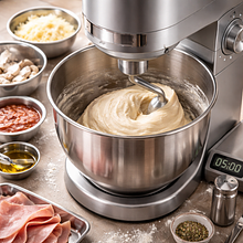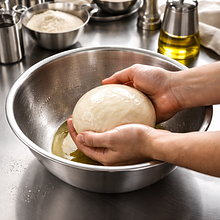 Przygotuj wszystkie składniki na ciasto: odmierz mąkę (400 g), wodę (260 ml), drożdże (12 g), sól (8 g), cukier (10 g) i oliwę (20 g). Ustaw miskę miksera lub dużą miskę do ręcznego wyrabiania. Przesiej mąkę do dużej miski, aby usunąć grudki i napowietrzyć ją.